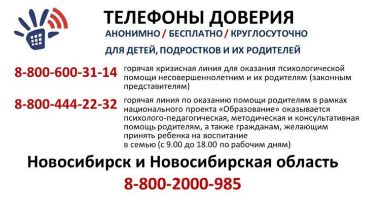 Сведения о действующих в Новосибирской области Общероссийском детском телефоне доверия, региональных горячих линиях психологической поддержки, центрах экстренной психологической помощи размещены на главной странице сайта ГБУ НСО «ОЦДК» снизу http://concord.websib.ru/.